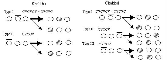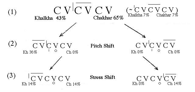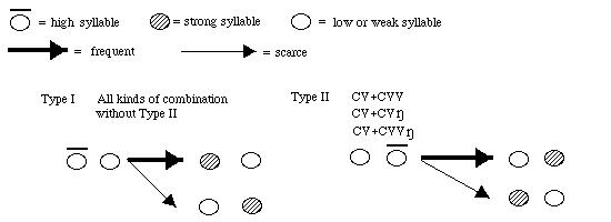 ア)/CVVCVCV/・/CVCVVCV/・/CVCVCVV/(B-1-3, B-2-3, B-3-3) 二重母音、長母音のある音節が高くかつ強いのは明白で、問題ない。 イ)/CVVCVCVV/・/CVCVVCVV/・/CVVCVVCV/(B-1・3-3,B-2・3-3,B-1・2-3) 間違いなく前の二重母音、長母音の音節が高くかつ強いのが判る。 ウ)/CVVCVVCVV/(B-1・2・3-3)