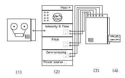 上述のように録音された音声を再生し、Pitch Indicatorによって分析し、それを記録するのであるが、記録方法は通常、Pen Writing RecorderとPhotocorderの二つある。不運にも外大の記録装置はどちらも故障であったので、東京学芸大学の再生・分析・記録装置を使わせていただいた。装置の詳細と接続図を下に記す。 再生; Tape Recorder Sony; 777A --- (図1)の中で番号 (1)で示す 以下同様 分析; Pitch Indicator JEIC; PI-3A (Japan Electronic Instrument Co.,Ltd.) --- (2) 記録; Photocorder 横河電機製作所 --- (3) 記録紙;Oscillograph paper C-123 Direct Visual (Oriental Photo Ind. Co.,Ltd.) --- (4) 再生レベル、その他スイッチ類は作動から停止まで常に一定であった。オシログラフペーパーは一次露光後、過剰露出にならないよう、直ちに複写して資料とした。 (図1) ![]() 先ず、再生された音声電流は増幅された後、一つはIntensity増幅部へ、もう一つはPitch抽出回路へ送られ、またもう一つはZero-crossing回路へ送られる。Pitch抽出回路は音声波を基本周波数(Pitch)の繰り返しを持つパルスに変換する。このパルスが放電管グリッドに到着した瞬間、放電が起こり、陽極は接地し、電位が零となって、次のパルスが到着するまでの間、陽極容量は再び充電を開始する。従って、次のパルスまでの時間が長ければ長いほど、つまり、Pitchが低ければ低いほど充電時間は長く、容量端子の電位が高くなるわけである。この電圧値を電磁オシログラフに記録させれば、Pitchの高いときは繰り返しが速くて小さく表れ、低いときには大きく表れることになる。Zero-crossing回路は音声波f(t)の振幅を、f(t)>0のとき常に一定値をAに、f(t)<0のとき-A或いは0となるようにさせる、即ちf(t)=0となる時点での間隔の時系列の大小を電流の大小に変化させるものである。簡単に言えば、母音のような一定のフォルマントを持つ波形は零ラインをクロスする回数が少なく、摩擦子音のように各周波数成分が均等であるような所謂white noise(白色雑音)の場合は、その回数が多くなるから、前者は電流の流れは小さく、後者では大きくなる訳である。これにより母音と子音の境界をを読みとることができる。 以上のような経路でPitch Indicatorを経た電流は記録するための装置Photocorderに流れ、Intensity(& time)、Pitch、Zero-crossingそれぞれの波形が記録紙に現れることになる。 Pitch IndicatorはこのようにIntensity(& time)、Pitch、Zero-crossingの時間的変化を同時に観察測定できるので、アクセントの研究のみならず、方言の研究、或いは、古代音楽、平曲の採譜保存等にも利用できる。 |