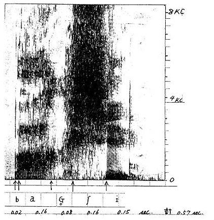 オシログラフペーパーに現れる波形を読む際、どの音が一体どこに現れているかを判断するには、多少の熟練が必要である。しかし、熟練したとしても、判断の困難な場合も生じることがしばしばある。この様な時、Sound Spectrogramを参照し、確実なものとする訳である。(図2)を見ていただきたい。今'багш'[![]() ![]() (図2)