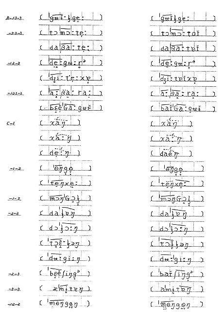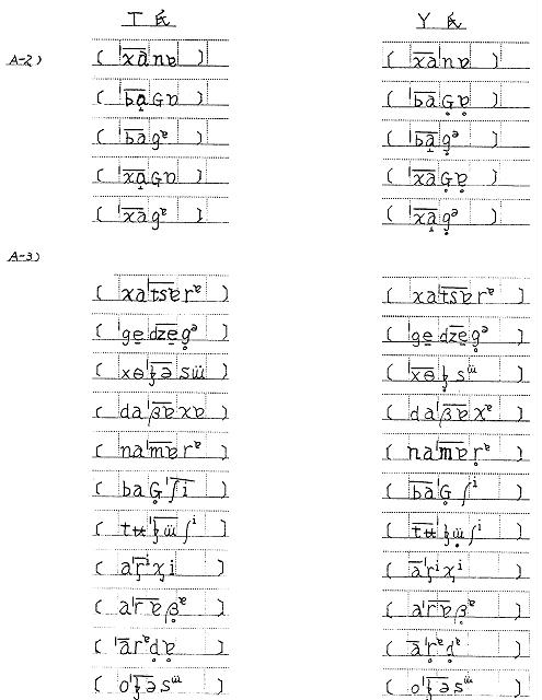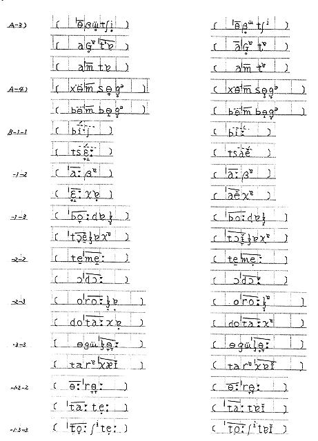 <表5> *規則に適する語数 (規則に反する語数) ![]() 横を見ていけば、それぞれの格語尾にどれだけこの規則の適用が期待できるかが解り、縦を見れば、それぞれの型に於けるその期待される値が解るようになっている。この表を見る際注意していただきたいのは、「強さ」とある欄は「強さ」から見て規則に適するかそうでないかを示すのであって、イコール「強い」訳ではない。例えば、「乙型・属格・強さ」の所を見ると「4(0)」とある。これは規則に適する語が強さから見ると四つあり、適さないものは無かったということを意味し、乙型は、二重母音を含む語で属格の二重母音が繋がっても、前の二重母音の方が強くなる筈なので(規則)、語尾は弱くなる訳で、まさにそうなる語が四つあったという訳である。従って、この場合の属格は弱く接尾することになる。以下、同様にこの表を見ていただきたい。 「高さ」の方がが「強さ」に比較すると、期待される値が少なくなっているのは、連続して発音される時しばしば現れるD+IとかA'+I等による上昇調子の影響と考えられるが、強さの方がここでは安定した現れ方を示している。この表から解るように、属格、対格の期待値が高く、奪格、造格の期待値が低くなっている。この期待値の低下は乙・丙型に帰するところが大きく、甲型にあってはその期待値は高いのである。従って、長母音、二重母音、/η/を含まない語(=甲)には、どの四つの格語尾も強く或いは高く、或いは、同程度の強さか高さを持って接尾すると言える。また、長母音を持つ語(=乙)と、/η/を持つ語(=丙)には、属格・対格は弱く或いは低く接尾し、奪格・造格にあっては、強く或いは高く、或いは同程度に接尾すると言えよう。この様に、<表1>からだけでは何ら規則性が見いだせないのが、<表5>によって、大体の規則性を見いだすことができた。が、無論、文中にあっては、様々に変化しより複雑な結果となる。その際の何らかの参考になればと思う。 B)Y氏に於ける語尾変化 <表2> T氏と異なり、'тэнхээ'という語を除いて、どの語にも大体一定の接続傾向が見られる。これは、T氏がそれぞれの語を下り調子で読み、時々上り調子をとったのに対し、Y氏はほとんど長母音を上り調子で読んだ為にこのようになった。しかし、与位格はどの語に対しても低くかつ弱くB音調を持って、また、3音節語を除く共同格が弱く(高さは不安定である)接尾している点は、T氏と変わりない。新たに表を作成するまでもなく<表2>によって、属格・対格・奪格・造格の四つの格語尾は、高く或いは強く接尾しているのが判る。'бθмбθг'や'буудал'に於いて、何故強さが低下しているのか、ここでは明白な理由は解らず、また、ほとんどの語を上り調子で読んでいるので、T氏に於いて示した様な推察をしてもあまり意味がないと思われるが、一応属格・対格(前が長母音の時を除く)・奪格・造格はどの語にも強く或いは高く接尾するとしておく。尚、'тэнхээ'は単独の発音では、тэн-が最も強く、-хээが最も高いのは、前述の通りだが、/CVηCVV/・/CVVCV(η)/という構造を有す他の語との接続形を調べなければ、接尾の特殊性に関して何とも言えそうにない。 C)両氏に於ける格語尾に関する相違 音調を比べると異なった型が使われていることが解るが、これは厳密な音調分析であって、聴覚的な違いはあまりないと思われる。T氏の場合は、下り調子の発音の変種、Y氏の場合は、上り調子の発音の変種がそれぞれ現れているに過ぎず、Y氏のHH'D型はT氏の'бθмбθг'の属格に現れたC型の変種である。従って、Y氏が属格・対格・奪格・造格を強く発音していることを除いて、両氏に於ける重大な格語尾に関する発音上の相違はないと思われる。 3-2-5. 活用(conjugation)語尾に関して<表3>・<表4> 'давах'(第2音節が強く高い)と'тойлох'(第1音節が強く高い)のアクセント位置が異なる2種の3音節語を選んで、活用語尾がどのように接尾するかを調べるのがここでの狙いである。先ず、'давах'に強く接尾するのが、長母音を含むものが多いのに気が付く。音調は大ざっぱに2種に分け、その示す内容は<表>に書いた通りである。ところが、'тойлох'を見ると今まで高くかつ強く接尾していた語が一挙に減り、必ずしも長母音、二重母音を含む語尾全部が、高いか強いということにはならない。命令形の語尾の多くが高く或いは強く発音されているのは、両氏に共通していて興味深い。また、T氏は強さによって、Y氏は高さによって、それぞれの語尾を際立てている様子が判るのは驚きである。これは方言の違いか、個人的な違いか今回の実験だけでは明白にできない。<表3>・<表4>は参考資料としてとどめておく。 <表3> T氏の場合 ![]() *語幹の内の最高の強さに比較して、語尾が「強い」か「同じ」か「弱い」かを示す。 **H1は語幹の最高点より高いところから音調が降下することを示す。H2は一度上昇してから下降するが、語幹の最高点よりも高い。H0は語幹