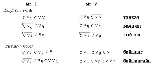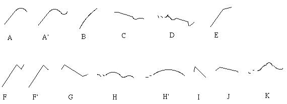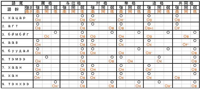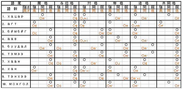 <表1> T氏の場合 *語幹の内の最高の高さ、強さに比較して、語尾が「強い」か「同じ」か「弱い」か、或いは「高い」か「同じ」か「低い」かを示す。 高さの欄のアルファベットは音調の型を表すもので14種類ある。<表1><表2>とも同様の表記。 ![]() <表2> Y氏の場合 *10.монголはテープ破損により、分析不能となったので、Y氏の場合、9.тэнхээまでである。 ![]() <音調の種類> ![]() 3-2-2. 3音節語に関して A)二重母音、長母音、/η/を含まない単語(A-3)
