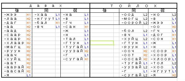 тэнхээ | 最初の'э'[![]() | 400~600 | 1,000~1,300 |