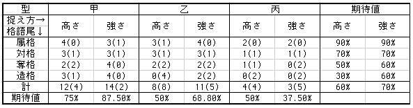 ここでの狙いはそれぞれの語尾がどの様な高さ、強さで接尾し変化するかを調べることにある。 A)T氏に於ける語尾変化<表3>